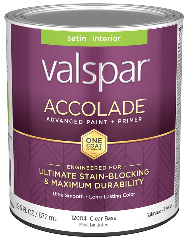 Valspar Accolade 1200 028.0012004.005 Latex Paint, Acrylic Base, Satin, Clear Base, 1 qt, Plastic Can