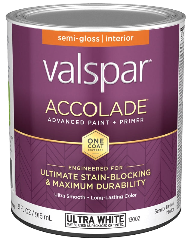Valspar Accolade 1300 028.0013002.005 Latex Paint, Acrylic Base, Semi-Gloss, Ultra White, 1 qt, Metal Can