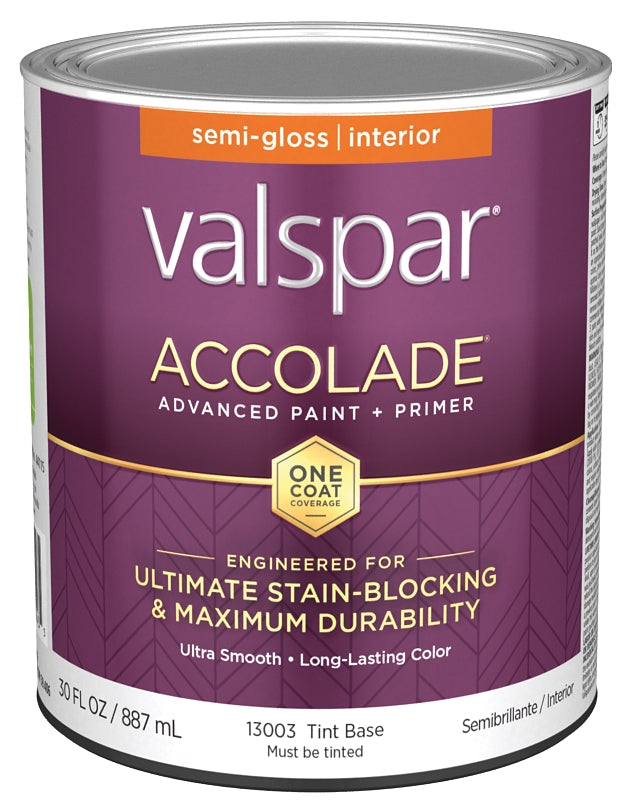 Valspar Accolade 1300 028.0013003.005 Latex Paint, Acrylic Base, Semi-Gloss, Tint Base, 1 qt, Plastic Can