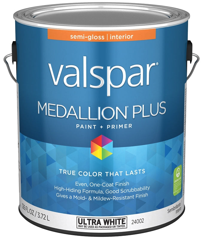 Valspar Medallion Plus 2700 028.0024002.007 Latex Paint, Acrylic Base, Semi-Gloss Sheen, Ultra White Base, 1 gal