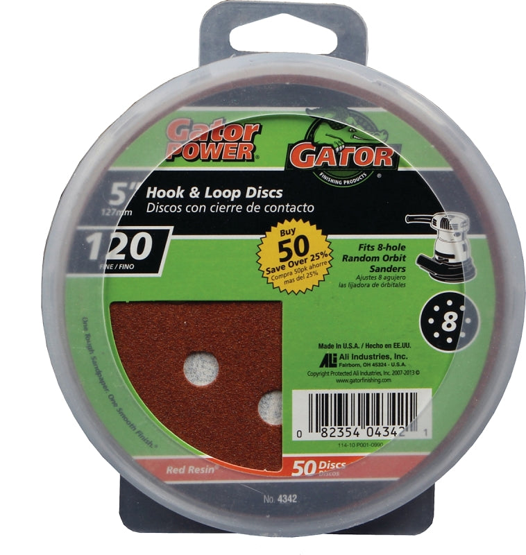 Gator 4342 Sanding Disc, 5 in Dia, 120 Grit, Fine, Aluminum Oxide Abrasive, Vented