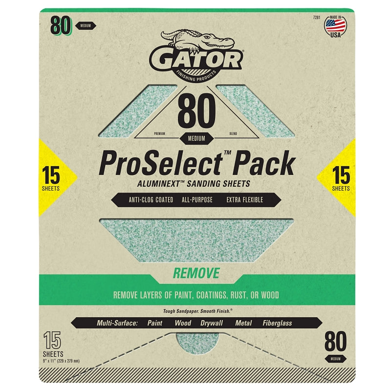 Gator 7281 Sanding Sheet, 11 in L, 9 in W, Medium, 80 Grit, Aluminum Oxide Abrasive