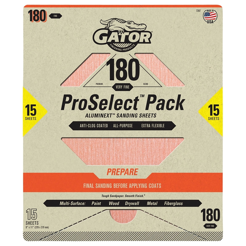 Gator 7287 Sanding Sheet, 11 in L, 9 in W, Fine, 180 Grit, Aluminum Oxide Abrasive