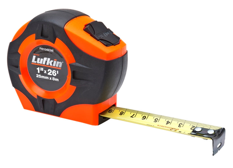Crescent Lufkin PHV1048CMEN Tape Measure, 26 ft L Blade, 1 in W Blade, Steel Blade, Rubber Case, Orange Case